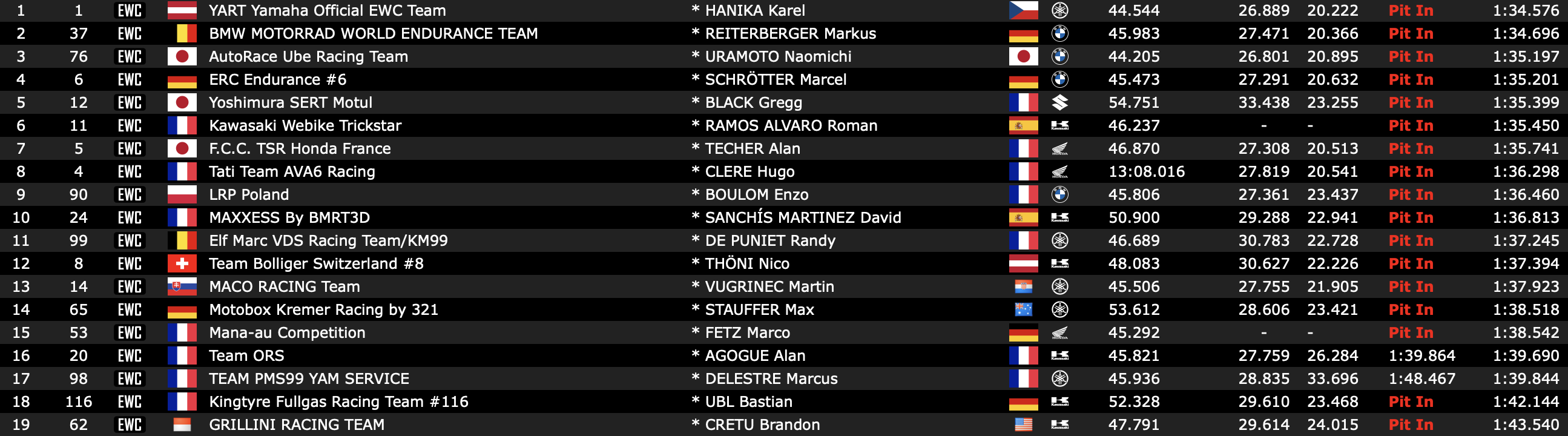 Chez les pilotes Bleus, Karel Hanika a enregistré le meilleur temps pour le Yart. Déjà en pole position des 24h Motos l’an dernier au Mans, il lançait ainsi les hostilités de la meilleure des manières pour permettre à son équipe d’entretenir ses espoirs de redite. Il a complété la séance avec un dixième d’avance sur Markus Retterberger, pilote de la BMW n°37 qui enregistrait le meilleur temps des EL1 plus tôt dans la journée.