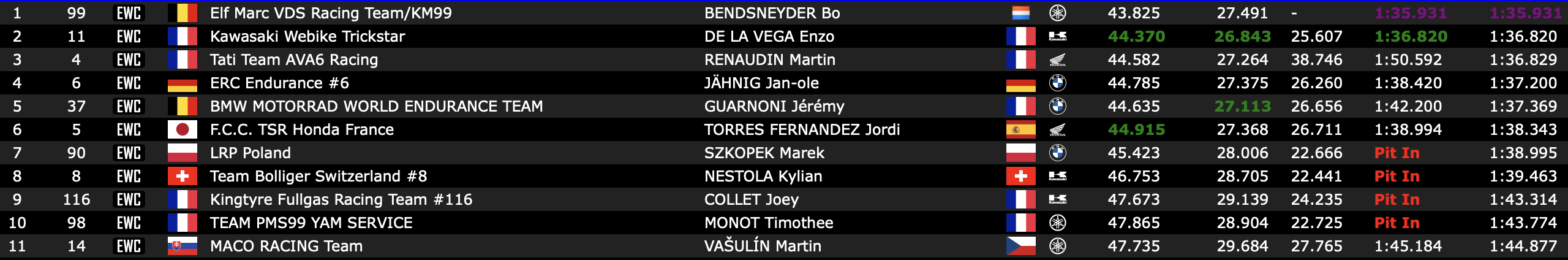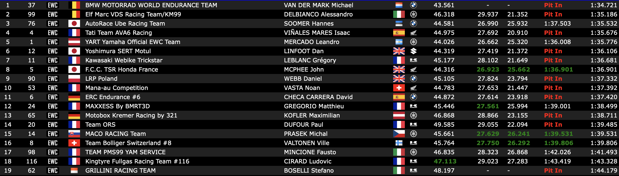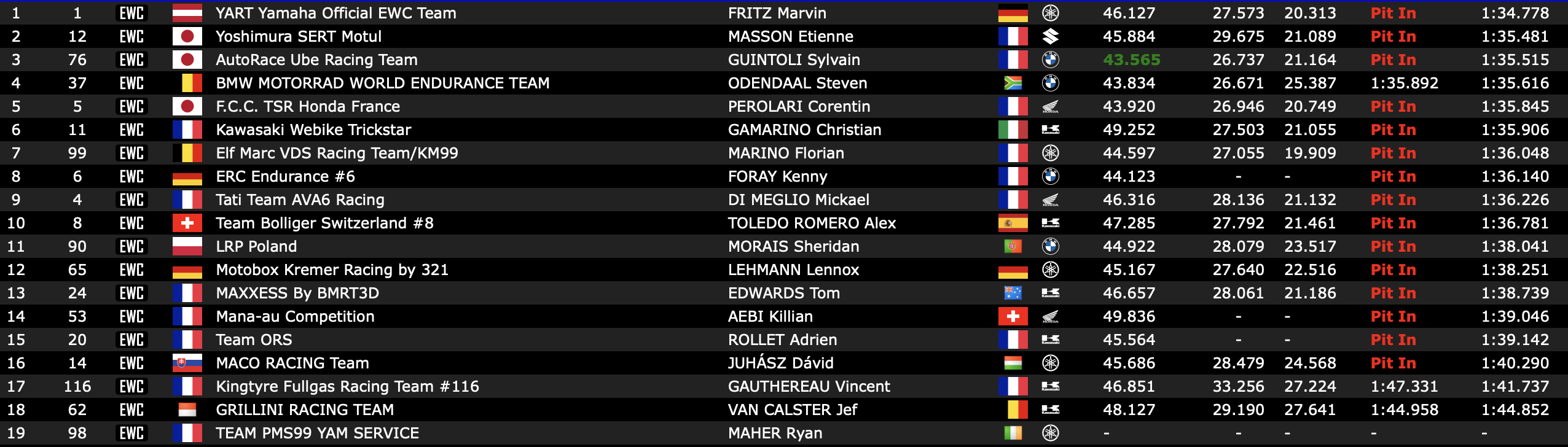 Le reste de la première ligne provisoire est complété par deux BMW. Derrière la machine d’usine, la n°37 qui s’offre une moyenne en 1:34/709, la n°76 du Team Ube Racing, emmenée par Naomichi Uramoto, Sylvain Guintoli et Hannes Soome, dépasse les attentes en bloquant la 3e place provisoire en 1:35.356. La Suzuki du Sert, poleman au Bol d’Or, n’est pour l’instant que 4e (1:35.440), mais tout peut encore se jouer demain lors de la deuxième partie de séance qualificative.