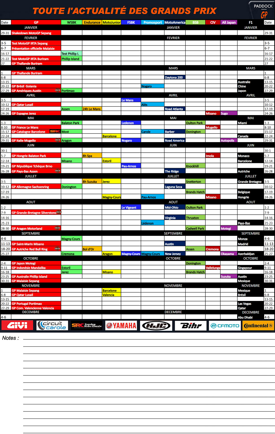 L’actualité impose des modifications de notre calendrier 2026 MotoGP, Superbike, EWC, MotoJunior, FSBK, Promosport, BSB, CIV, MotoAmerica, All Japan et F1 qui réunit dans un seul tableau, bien pratique une fois imprimé, les dates des courses à venir pour organiser votre année 2026 et éventuellement effectuer quelques réservations…