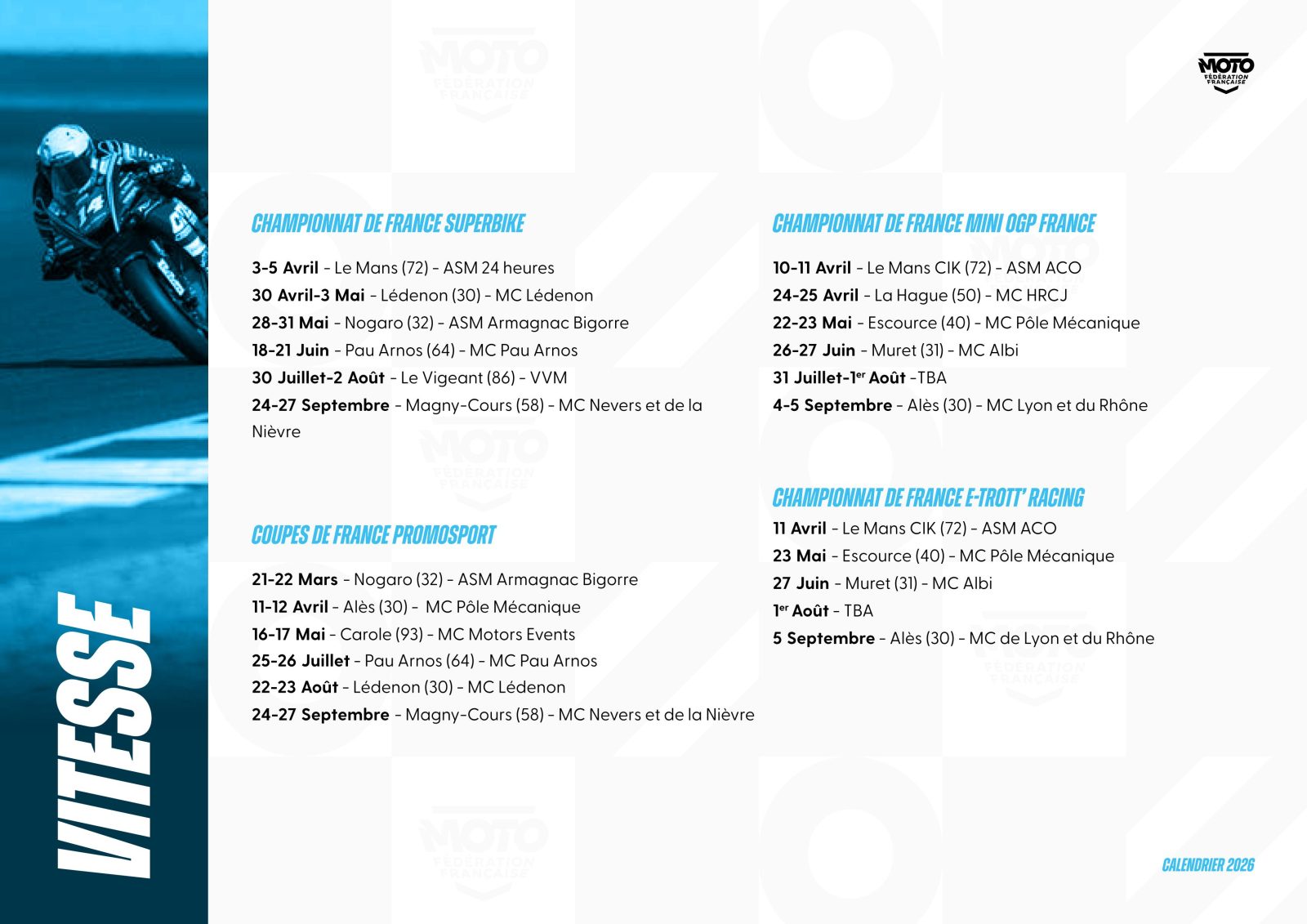 La Fédération Française de Motocyclisme a levé le voile sur le calendrier prévisionnel du FSBK et des Championnats et Coupes de France 2026.