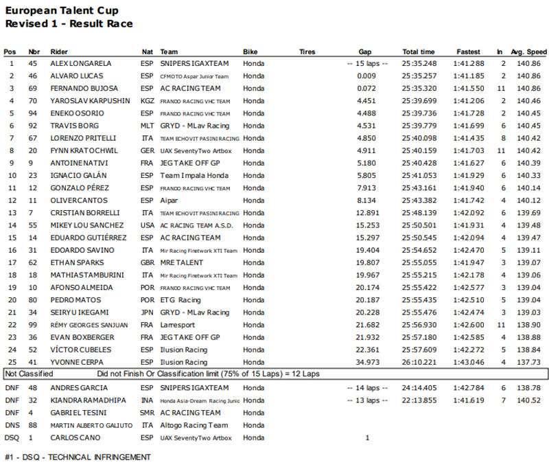 Avec le titre en jeu, Bujosa n’avait d’autre choix que de gagner, et il a abordé le dernier virage en tête avant que Longarela ne plonge à l’intérieur pour s’imposer, Lucas lui ravissant également la deuxième place sur la ligne. La troisième place semblait insuffisante pour le pilote espagnol, mais un rebondissement est survenu après le drapeau à damier. Cano a malheureusement reçu une disqualification technique, faisant de Bujosa le Champion European Talent Cup 2025 !