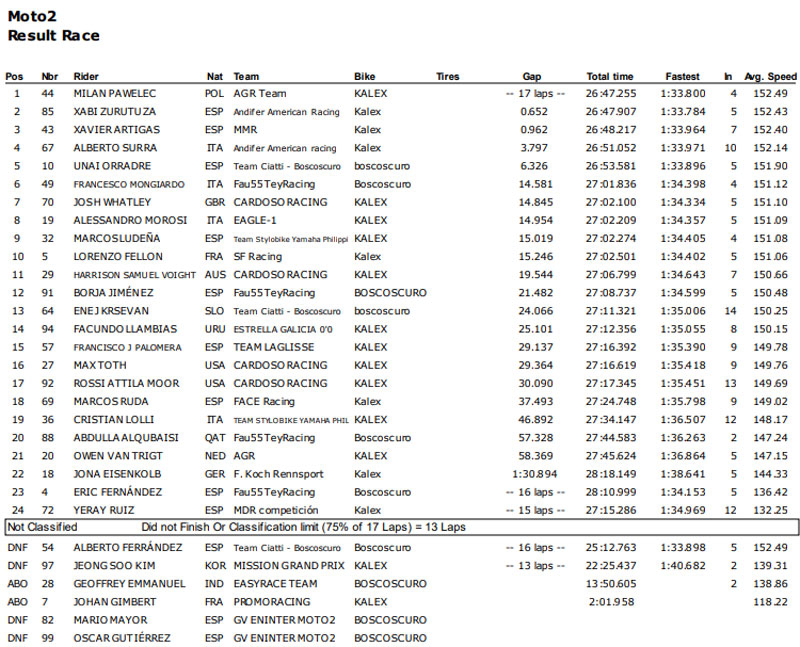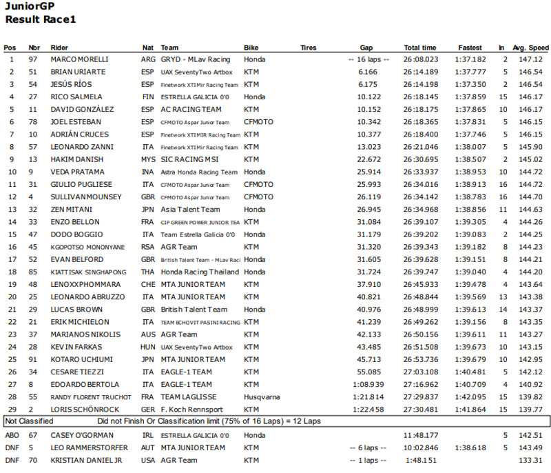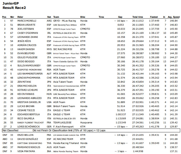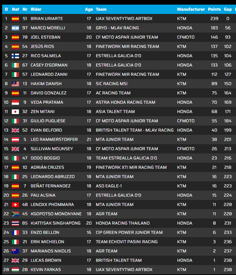 La Course 2 a de nouveau vu ces trois pilotes en lutte en tête, mais cette fois Uriarte a suivi Morelli jusqu’au bout, l’empêchant de s’échapper. Le rythme s’est ensuite avéré trop élevé pour Rios, le n°54 chutant et laissant Joel Esteban (CFMoto Junior Aspar Team) récupérer la dernière place sur le podium, à la fois en course et au championnat.