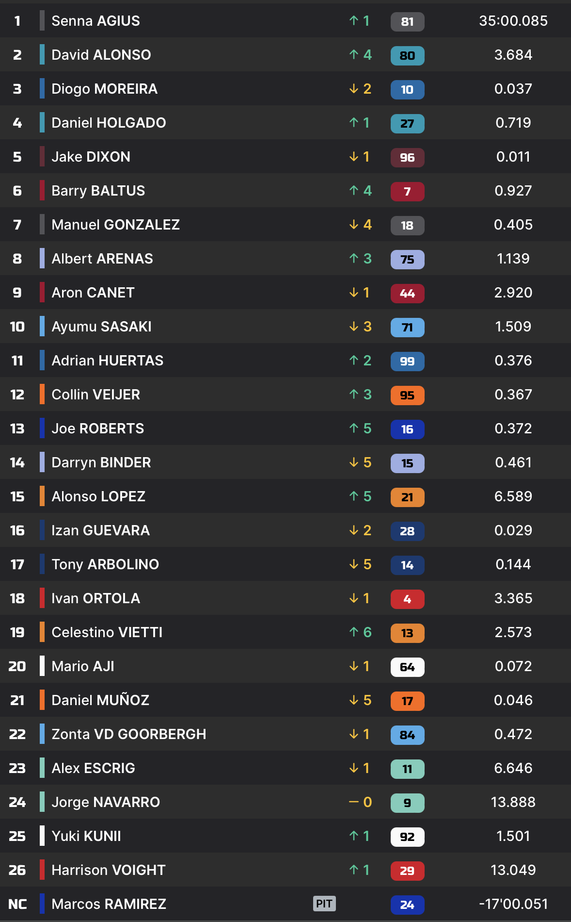 Le duo de Sud-Américains se retrouve alors à 1,5 seconde de Senna Agius, leader. Voyant l’Australien creuser l’écart, Diogo Moreira cherche la solution dans chaque virage sur David Alonso, mais ne parvient pas à passer. Sous pression, ce dernier craquera finalement au virage 10 dans le 11e tour, prenant une trajectoire large. Débarrassé de son grand adversaire du début de course, il n’est cependant pas débarrassé de Manuel Gonzalez. Les deux hommes se livrent alors un duel de haute précision, où la moindre erreur peut coûter extrêmement cher pour le championnat.