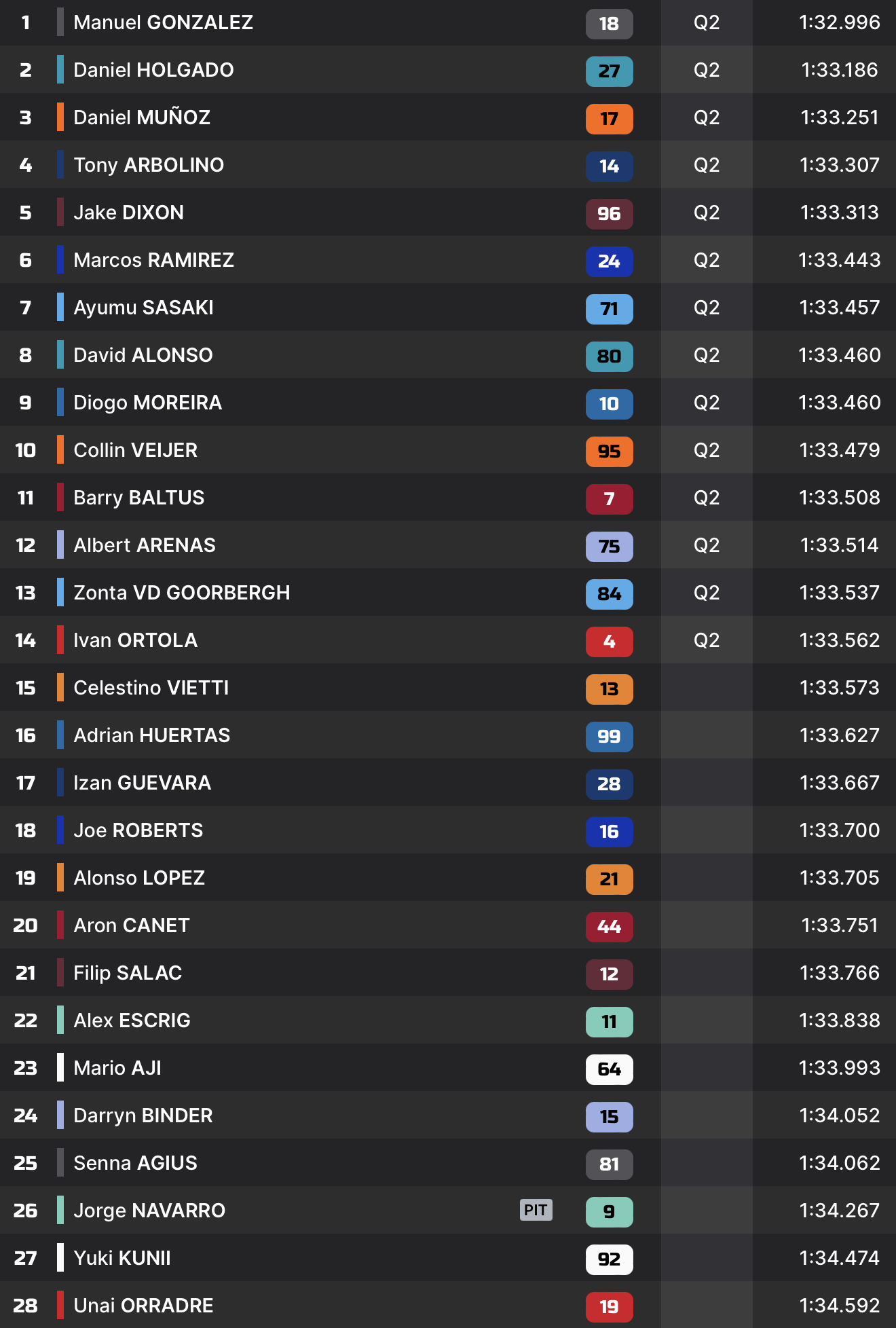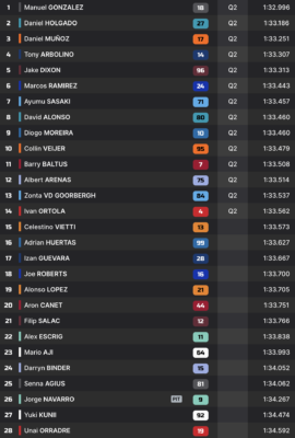 Daniel Holgado et Daniel Muñoz complètent le top-3. Barry Baltus s’offre le 11e temps de la séance, et se qualifie également pour la Q2 d’emblée. En toute fin de séance, Aron Canet chute dans le secteur 4, alors qu’il ne figurait pas parmi les 14 premiers. Il achève la Practice au 2E0e rang, et devra passer par la Q1 pour la deuxième fois de suite ce samedi.