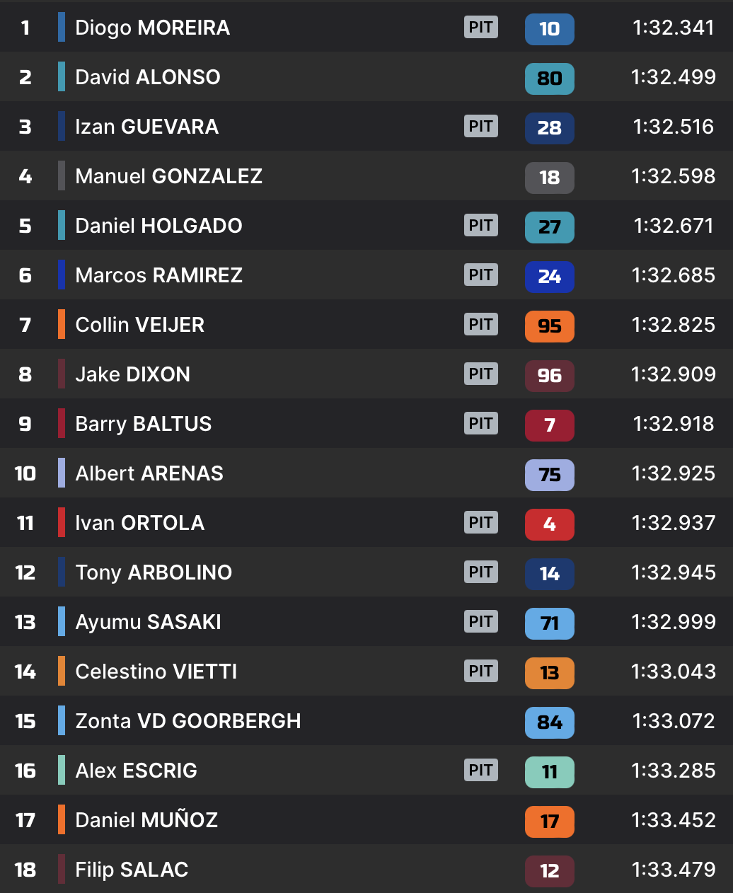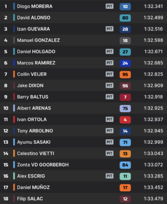 Devant le drapeau à damier, ces trois hommes se sont toutefois surprendre par Diogo Moreira, venu claquer un tour en 1:32.341. David Alonso sauve la 2e place, tandis que Izan Guevara complétera la première ligne.
