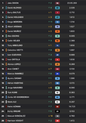 Devant, Jake Dixon ne tremble pas et remporte une nouvelle victoire cette saison, devant David Alonso et Barry Baltus. Aron Canet terminant seulement 15e, le Belge prend également la 3e place du championnat.