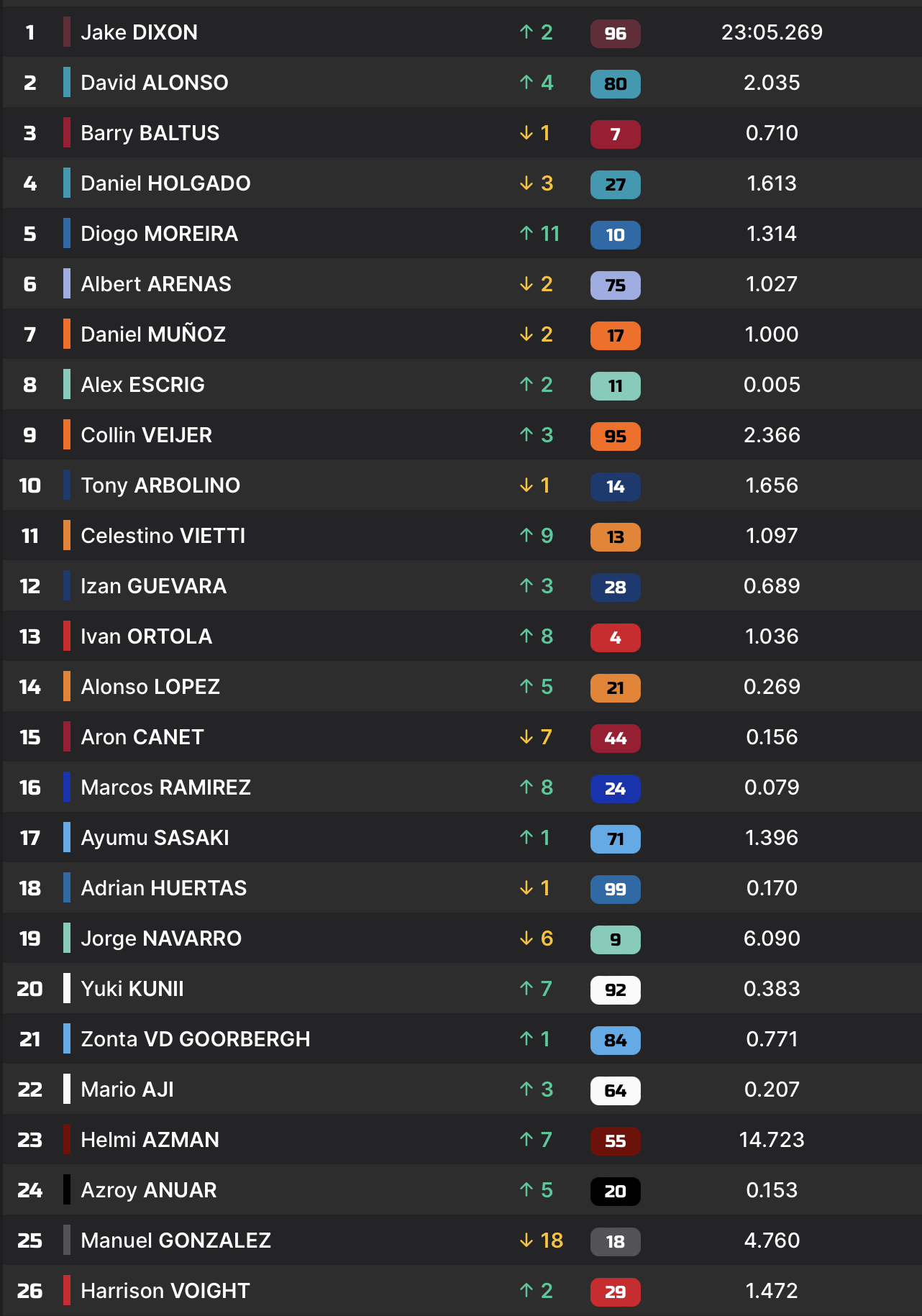 Devant, Jake Dixon ne tremble pas et remporte une nouvelle victoire cette saison, devant David Alonso et Barry Baltus. Aron Canet terminant seulement 15e, le Belge prend également la 3e place du championnat.