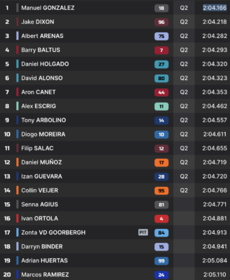 Les pilotes Fantic, Aron Canet et Barry Baltus, terminent respectivement 4e et 7e. Ils se qualifient donc tous les deux pour la Q2. Il en est de même pour les pilotes du Team Aspar, qui jouent ce week-end le titre de rookie de l’année. David Alonso se classe 6e de la Practice. Daniel Holgado termine 5e.