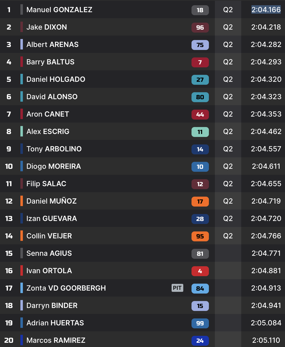 Tony Arbolino est le premier à signer un temps de référence. La hiérarchie n’évolue pas avant la fin de séance. Manuel Gonzalez signe alors un temps en 2:04.166, bien plus rapide que les premières marques. Devant le drapeau à damier, l’Espagnol conserve le meilleur temps de la Practice. Il assène ainsi un premier coup à son rival, Diogo Moreira, dans la lutte pour le titre mondial à Sepang.