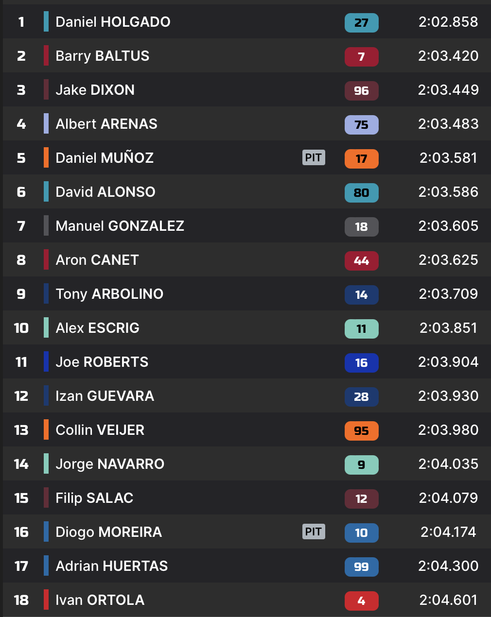 La lutte fait rage dès les premiers tours de roues en Moto2, on assiste notamment à un duel pour la position en piste entre Diogo Moreira et Manuel Gonzalez, qui se dépassent à plusieurs reprises dans leur tour de préparation. Mais après les premiers runs de chacun, c’est le Belge, Barry Baltus, qui s’offre la pole position provisoire, en 2:03.559. Le top-3, complété par Albert Arenas et Daniel Holgado, se tient alors en 60 petits millièmes, et la lutte pour la pole position reste très ouverte.