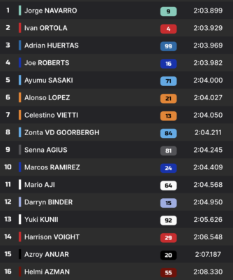 Manuel Gonzalez n’est que 6e sur la grille de départ, Aron Canet 8e. Diogo Moreira commet une erreur dans son dernier tour rapide, et ne se qualifie que 16e sur la grille de départ. Barry Baltus est donc le mieux placé des 4 pilotes qui peuvent encore prétendre au titre mondial.