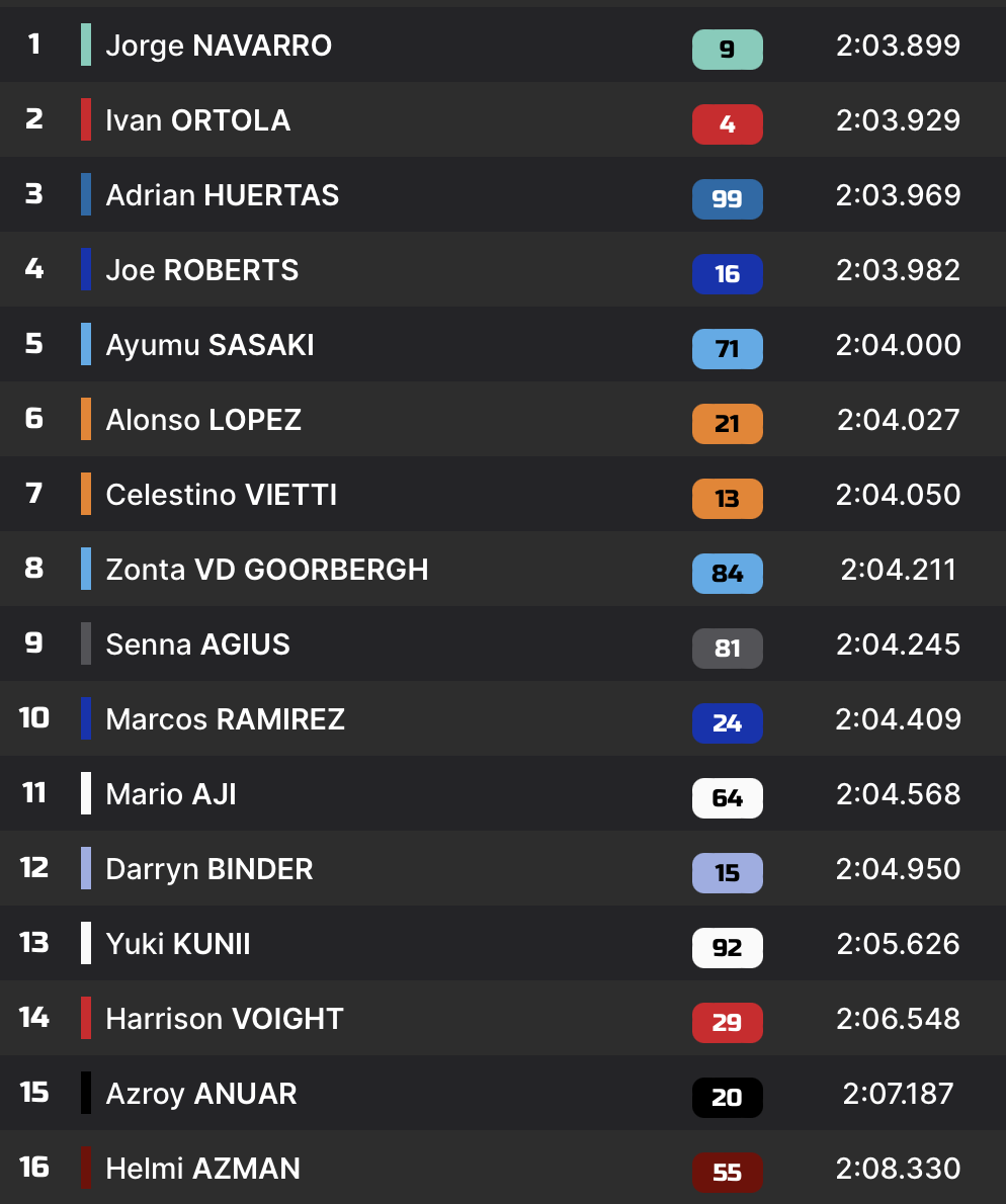 | Q1 | 2’05.202 Somkiat Chantra | 2’03.899 Jorge Navarro |