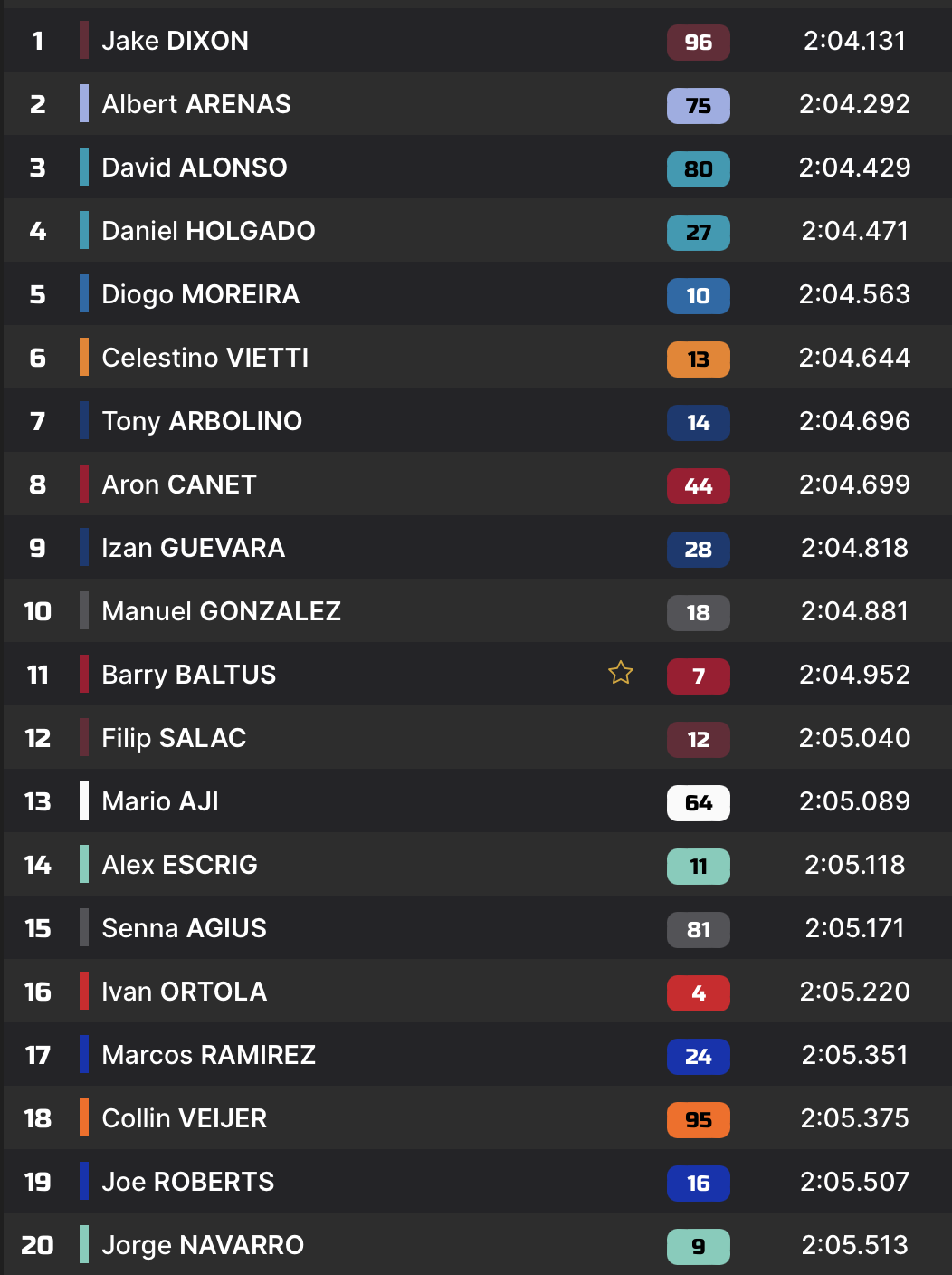 Côté chrono, Diogo Moreira prend la main d’entrée de jeu, mais Jake Dixon place rapidement la barre haut. À plus de dix minutes de la fin du temps imparti, le Britannique hausse le ton. Il signe alors un chrono en 2:04.131, une demi-seconde plus rapide que le reste du peloton. Cette marque lui permet de s’emparer du nouveau record du circuit.