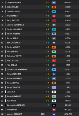 À quelques tours de l’arrivée, Collin Veijer se retrouve en délicatesse avec ses gommes. Il voit ainsi Diogo Moreira revenir à deux dixièmes de lui. Il passe à l’attaque à trois tours de l’arrivée, et prend le meilleur sur le Néerlandais sans difficulté. La suite est plus calme, et le Brésilien s’envole vers une nouvelle victoire. Manuel Gonzalez terminant 6e, le n°10 se dirigera vers Valence avec 24 unités d’avance.