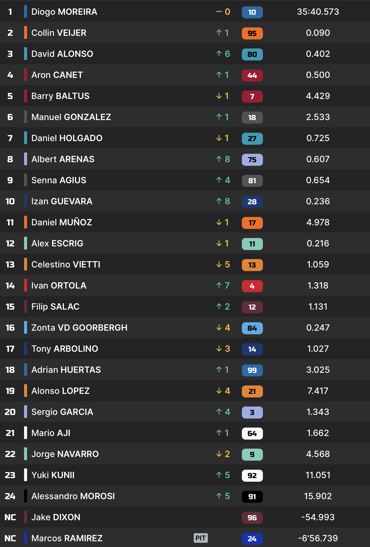 À quelques tours de l’arrivée, Collin Veijer se retrouve en délicatesse avec ses gommes. Il voit ainsi Diogo Moreira revenir à deux dixièmes de lui. Il passe à l’attaque à trois tours de l’arrivée, et prend le meilleur sur le Néerlandais sans difficulté. La suite est plus calme, et le Brésilien s’envole vers une nouvelle victoire. Manuel Gonzalez terminant 6e, le n°10 se dirigera vers Valence avec 24 unités d’avance.