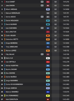 | Practice | 1’42.362 Alonso Lopez | 1’41.210 Aron Canet |