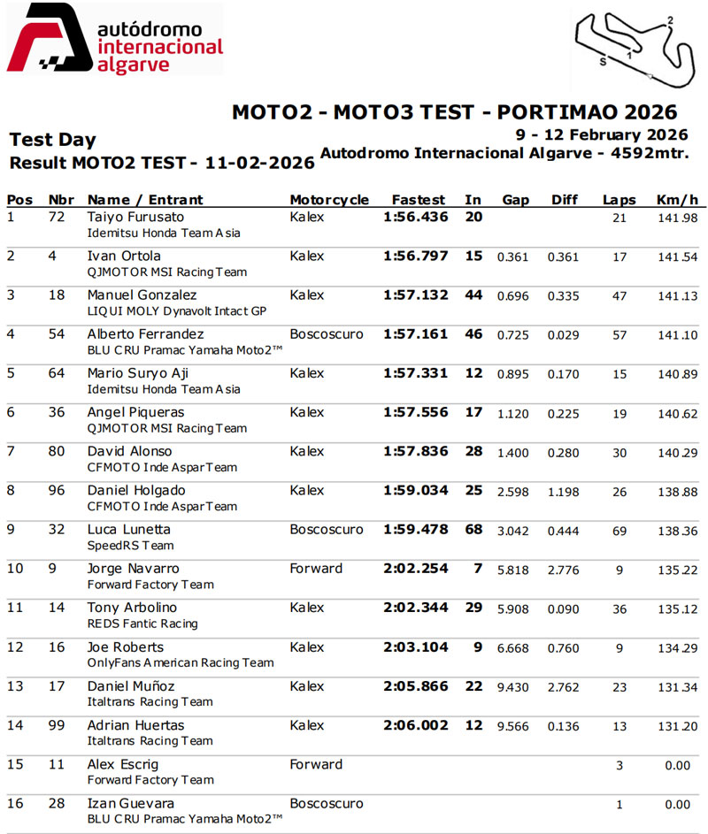 Dès lors, vous pouvez imaginer le déroulement de la journée : plus d’une heure sans aucune activité avant que Luca Lunetta (SpeedRS Team) ne s’avère le plus courageux et inaugure la séance en faisant un rapide tour de la situation, avant d’être rejoint dans les deux heures suivantes par Joe Roberts (OnlyFans American Racing Team), Daniel Muñoz (Italtrans Racing Team), Tony Arbolino (REDS Fantic Racing), Adrian Huertas (Italtrans Racing Team), Manuel Gonzalez (LIQUI MOLY Dynavolt Intact GP), Alberto Ferrandez (BLU CRU Pramac Yamaha Moto2™) et Izan Guevara (BLU CRU Pramac Yamaha Moto2™).