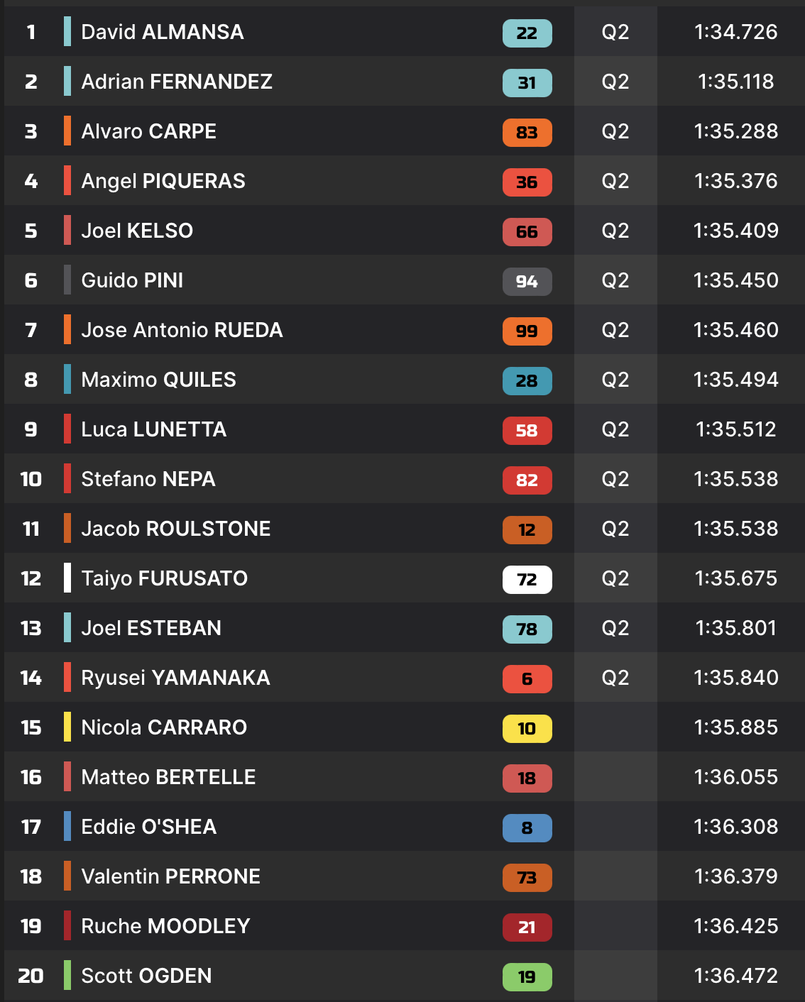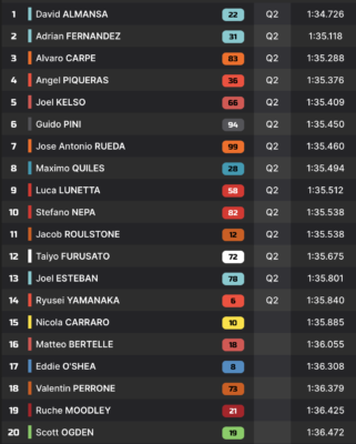 Angel Piqueras, Joel Kelso, Jose Antonio Rueda et Maximo Quiles se talonnent dans le top-8 au marquoir. Ils sont donc tous qualifiés pour la Q2.
