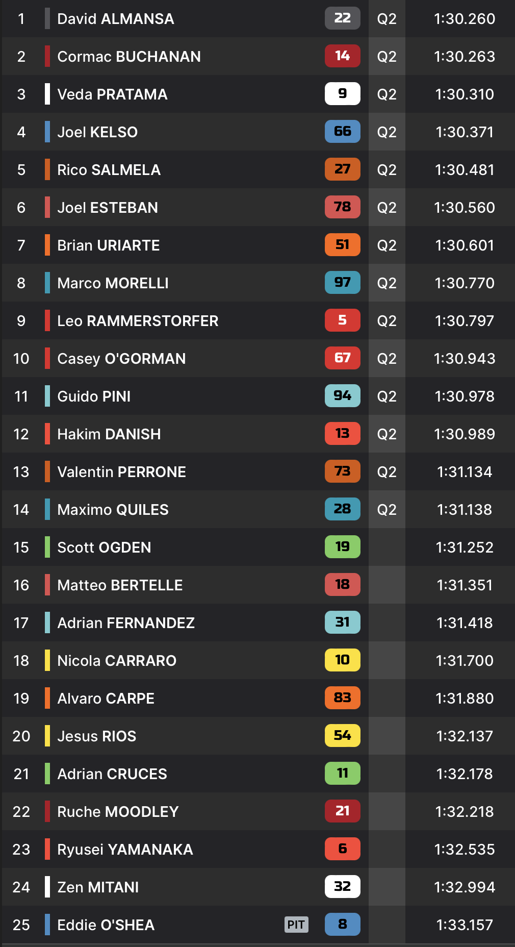 Devant le drapeau à damier, c’est toutefois David Almansa qui conclut avec le meilleur temps, coupant la ligne en 1:30.260. Cormac Buchanan et Veda Pratama complètent le top 3.