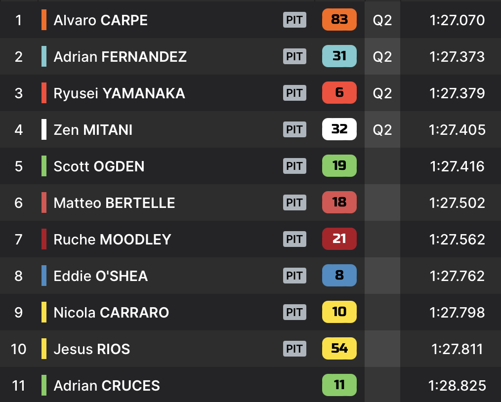 En Q1, Alvaro Carpe, piégé la veille par les conditions météo, n’a pas laissé le choix à ses adversaires. Auteur du meilleur temps de la séance en 1:27.070, il devance son plus proche poursuivant de trois dixièmes. En deuxième position, Adrian Fernandez sauve les meubles après une chute en début de séance. Sa qualification relève presque du miracle. Ryusei Yanamaka et Zen Mitani complètent le top 4 qui se qualifie pour la Q2.