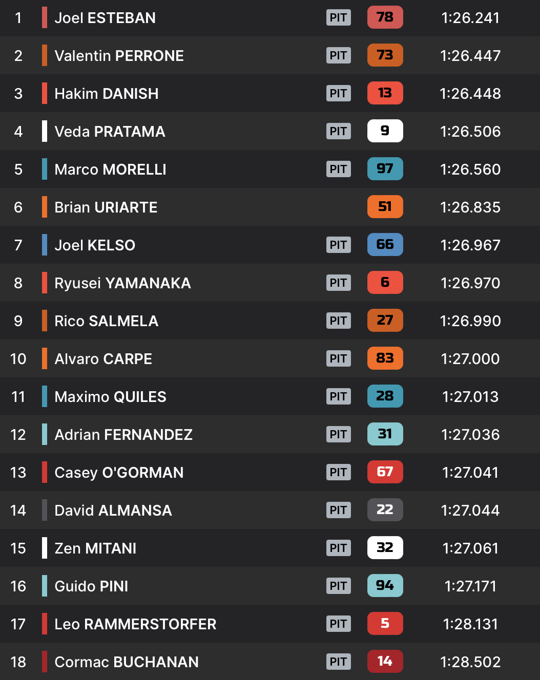 Lors des seconds runs de chacun, beaucoup de pilotes étaient en train d’améliorer avant que Brian Uriarte ne chute, pour déclencher des drapeaux jaunes. Cela n’empêche pas Joel Esteban d’améliorer, pour décrocher la pole provisoire en 1:26.241. Personne en viendra battre son chrono, puisque Valentin Perrone et Hakim Danish échouent à deux dixièmes de sa tentative.