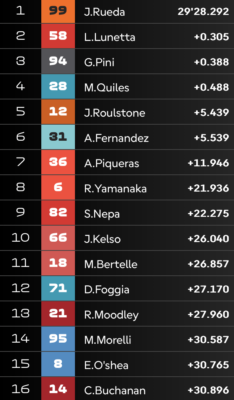 Après avoir attribué toutes les pénalités pour Long Lap non servis, et incidents de course, les positions évoluent dans le Parc Fermé, et Luca Lunetta et Guido Pini l’accompagnent sur le podium final.