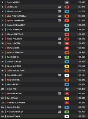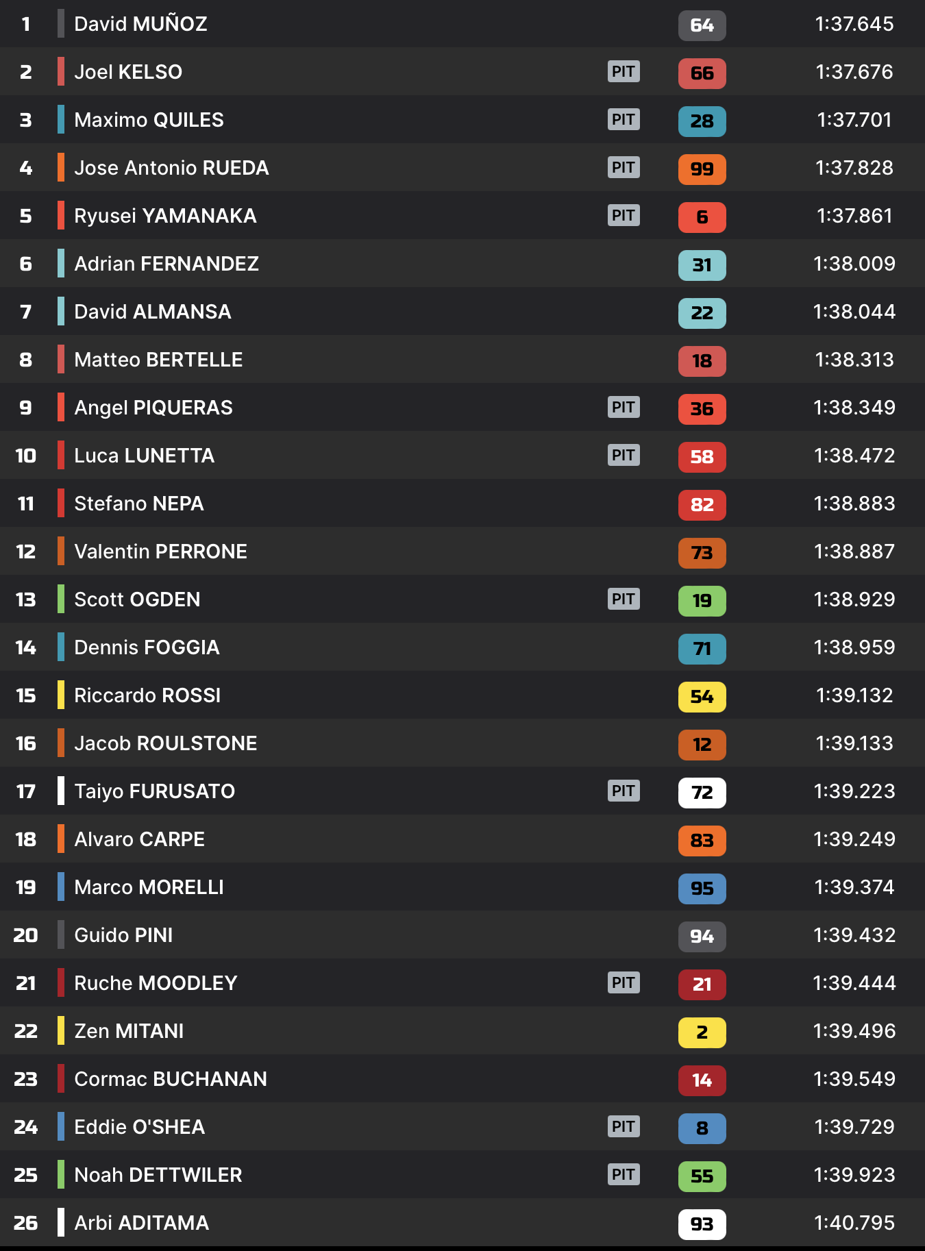 Côté chrono, David Muñoz est le plus rapide en piste. Le pilote Intact GP se met devant dès les premiers tours de roue, et parvient à conserver la tête du classement en améliorant régulièrement. Avant les dernières tentatives de chacun, il détient une référence posée en 1:37.645. Joel Kelso le talonne, pointant à seulement quelques millièmes de la référence.
