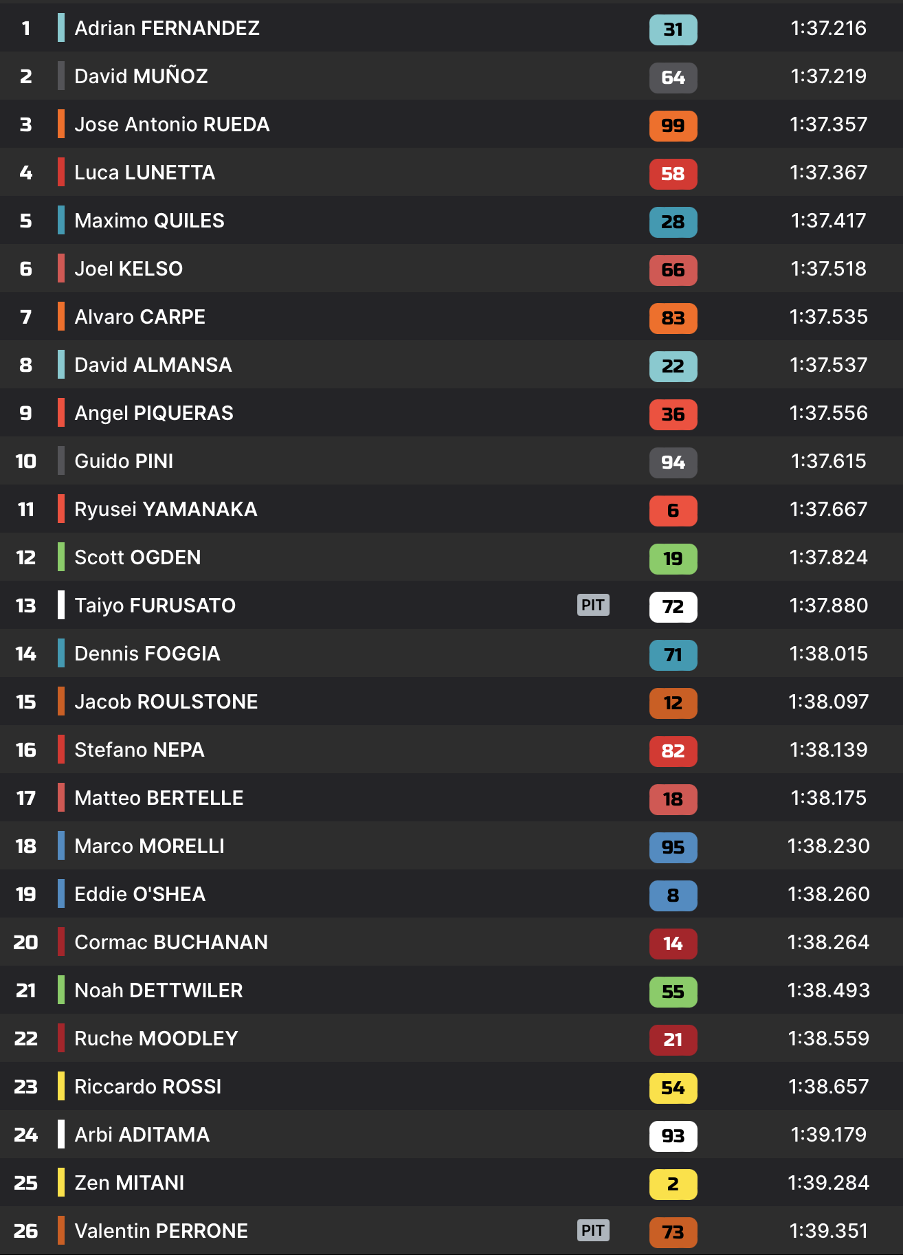 Côté chrono, David Muñoz est encore une fois le plus en forme. C’est lui qui s’offre la référence d’entrée de jeu, et qui trône en tête du marquoir durant toute la séance, grâce à un temps en 1:37.435. Luca Lunetta, Joel Kelso et Alvaro Carpe le suivent de très près, puisqu’après 10 minutes d’action, ils se tiennent en un dixième seulement.