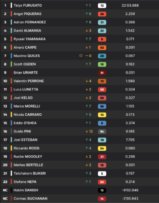 Alors qu’il restait 4 prétendants au podium, il n’y en a plus que deux à l’entame du dernier tour. David Almansa ruine ses chances en commettant une erreur similaire à celle de Maximo Quiles dans le dernier virage au circuit. Guido Pini de son côté chute en tentant un dépassement sur Adrian Fernandez. Angel Piqueras et Adrian Fernandez remporte donc cette lutte par élimination, et décrochent les 2e et 3e places de la course dans cet ordre. Devant, Taiyo Furusato fait preuve d’une grande maîtrise, et s’impose sans trembler par plus de deux secondes d’avance.