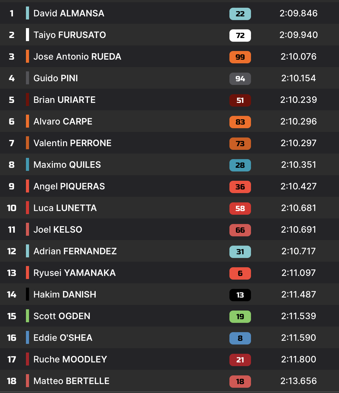Q1 2’10.699 Joel Kelso 2’11.261 Ryusei Yamanaka