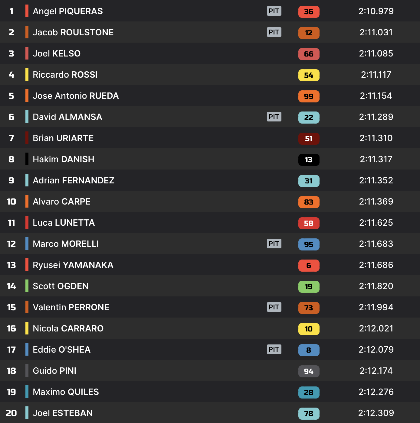Au terme d’une séance calme, le classement n’évolue que devant le drapeau à damier. Angel Piqueras conserve la tête, améliorant en 2:10.979 à la fin du temps imparti. Joel Kelso le suit de près, et claque un chrono en 2:11.085. Suffisant pour se placer devant Riccardo Rossi, mais pas pour contenir l’amélioration de Jacob Roulstone, qui remet en deuxième position lors de son ultime effort.