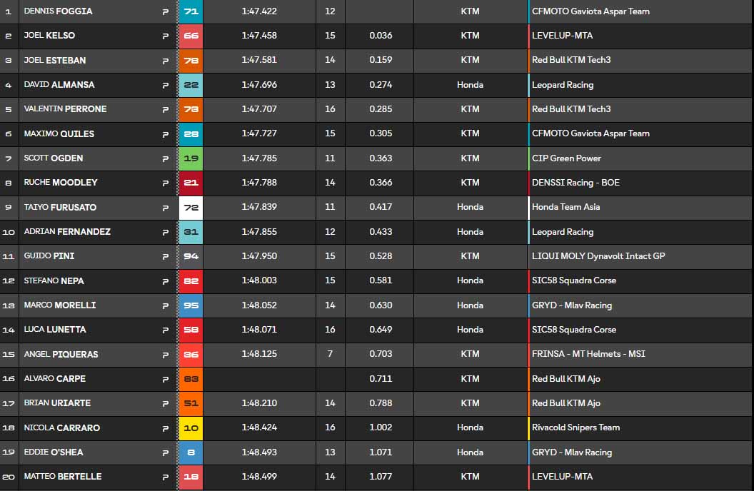 Joel Kelso (KTM Levelup MTA) est le premier à inscrire un temps significatif, alors que la séance débute de manière très calme, comme c’est souvent le cas. David Almansa (Honda Leopard Racing) le suit, juste devant Angel Piqueras. À noter : la catégorie compte énormément d’absents, à commencer par Rueda et Dettwiler. David Munoz (KTM Liqui Moly Intact GP), toujours blessé, n’est pas de la partie, tout comme Ryusei Yamanaka (KTM MT Helmets MSi). C’est une hécatombe.