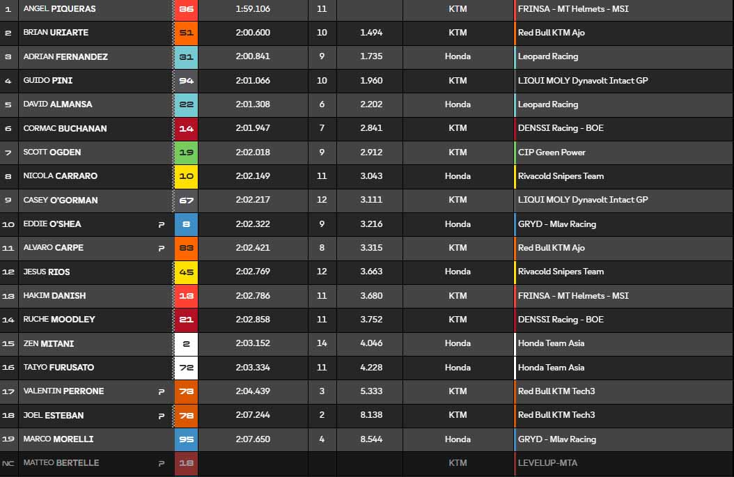 Brian Uriarte (Red Bull KTM Ajo), le remplaçant de José Antonio Rueda, occupe aussi les premières positions mais sans pouvoir battre Piqueras. À savoir qu’il a gagné le championnat JuniorGP et la MotoGP Red Bull Rookies Cup cette saison.