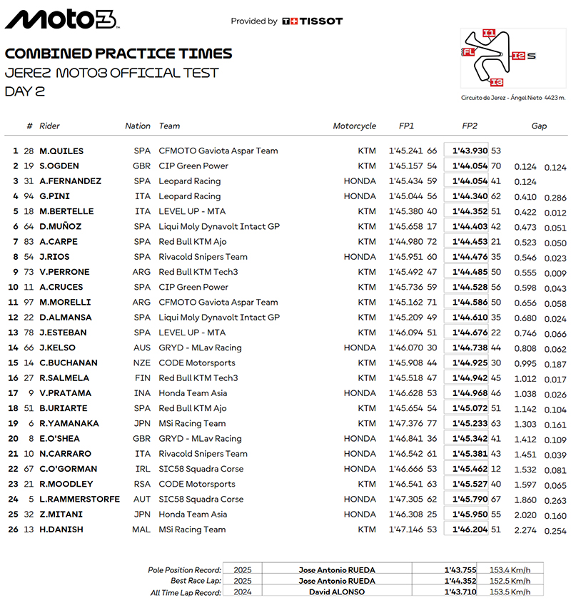 Le record du tour, détenu par José Antonio Rueda depuis le dernier Grand Prix (1’44.352), a été pulvérisé par Quiles, qui n’était qu’à deux dixièmes de seconde du meilleur temps Moto3 sur ce circuit, un record détenu par David Alonso (1’43.710).