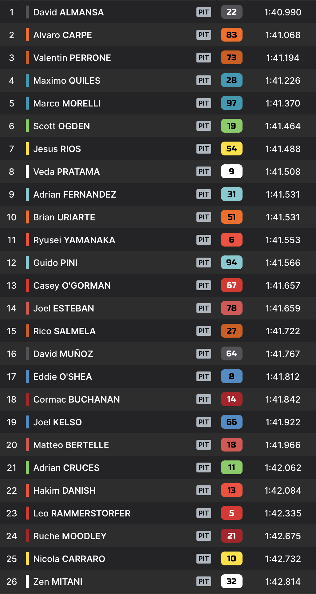 Quelques uns des hommes qui ont animé le championnat l’an dernier se retrouvent en fond de classement au terme de la séance Practice. David Munoz occupe le 16e rang, devant Joel Kelso (19e). Ils se disputeront les quatre dernières places encore disponibles pour la Q2, lors de la Q1, programmée ce samedi après-midi à Buriram.
