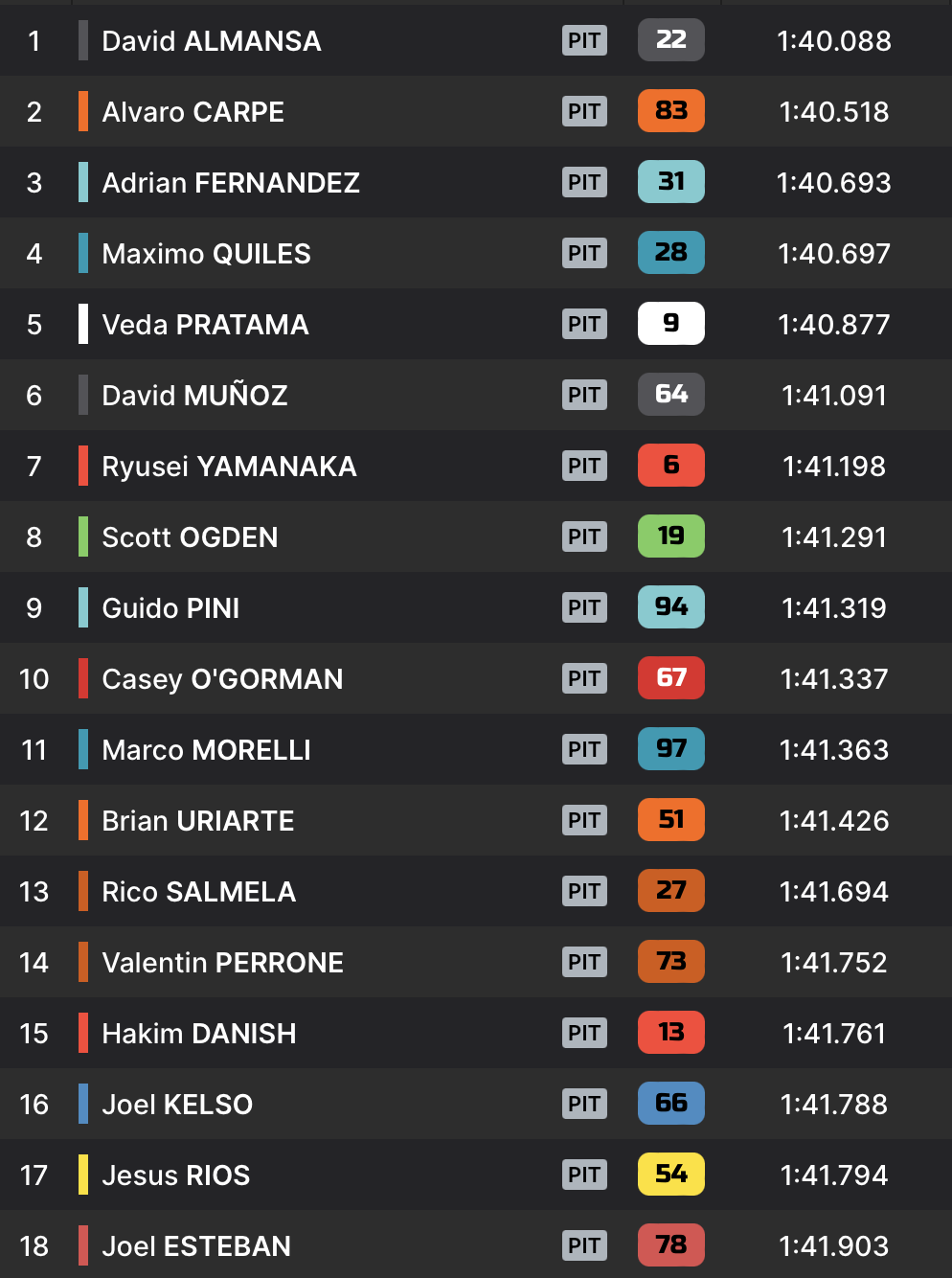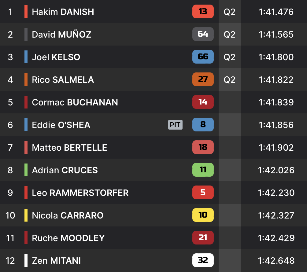 Ainsi, Hakim Danish remporte la Q1 grâce à un temps signé en 1:41.476, au coeur d’un groupe de pilotes dans lequel David Munoz est aussi parvenu à améliorer, pour couper la ligne en 1:41.565 et s’emparer de la deuxième position. Longtemps leader, Joel Kelso complète le top 3 en 1:41.800. Rico Salmela crée la surprise, arrachant le 4e temps sur le fil en faisant à peine 17 millièmes de mieux que Cormac Buchanan. Le n°27 s’empare donc de la dernière place qualificative pour la Q2.