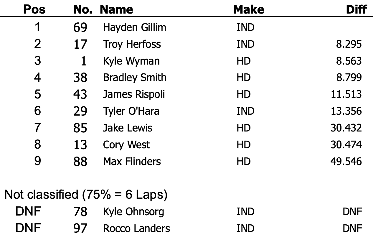 Course 1 : Enfin, le moment tant attendu est arrivé, et Indian Motorcycle n’a pas trahi son statut. Hayden Gillim, a survolé l’épreuve avec plus de huit secondes d’avance sur son plus proche poursuivant. Herfoss décroche quant à lui la 2e place après un duel serré avec Wyman. Il sauve ainsi les meubles après sa chute de la matinée. Son adversaire termine 3e malgré une erreur. Bradley Smith termine 4e, profitant de la panne mécanique de Landers, qui a abandonné alors qu’il visait le podium.