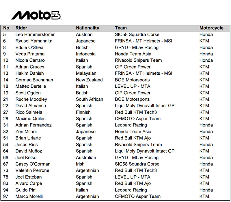 Rammerstorfer, Veda Pratama, Hakim Danish, Rico Salmela, Brian Uriarte, Jesús Rios, Joel Esteban, Guido Pini, Marco Morelli, Adrián Cruces, Zen Mitani, Casey