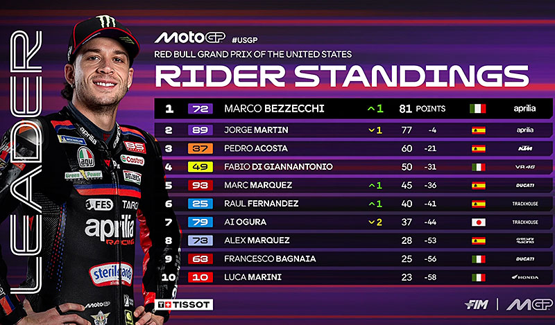 À peine descendu de sa RS-GP 2026 de l’équipe d’usine Aprilia après avoir remporté le Grand Prix MotoGP 2026 des États-Unis sur le circuit d’Austin, Marco Bezzecchi s’est confié devant les caméras du site officiel MotoGP.com avec la la joie de se rattraper de son erreur dans le Sprint, et de reprendre la tête du championnat, tout en rejoignant le club des auteurs de 5 victoires consécutives composé des seuls Valentino Rossi et Marc Marquez pour l’ère moderne…