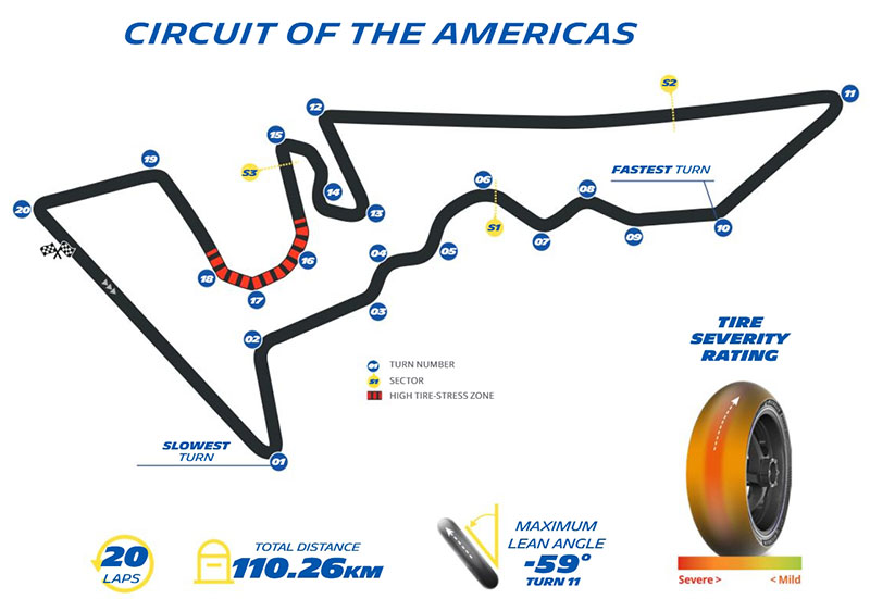 Le Circuit des Amériques (COTA), situé à Austin (Texas), accueille le MotoGP™ depuis 2013. Long de 5,513 km, il propose 20 virages (11 à gauche et 9 à droite), un dénivelé spectaculaire avec une montée de 40 mètres dès le premier virage, ainsi qu’une ligne droite de plus de 1 200 mètres où les vitesses dépassent les 350 km/h.