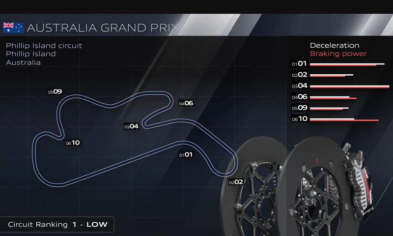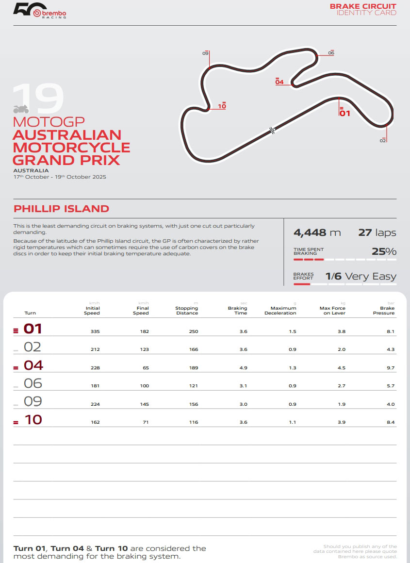 Selon les techniciens de Brembo qui travaillent en étroite collaboration avec tous les pilotes de MotoGP, le circuit de Phillip Island, long de 4,448 km, est le moins exigeant de la saison 2025 en termes de freinage. Sur une échelle de 1 à 6, il n’obtient qu’un indice de difficulté de 1, car il ne compte que six zones de freinage par tour, pour un total de moins de 22 secondes de freinage. De plus, le circuit ne comporte qu’un seul point de freinage de catégorie élevée et deux de catégorie moyenne.
