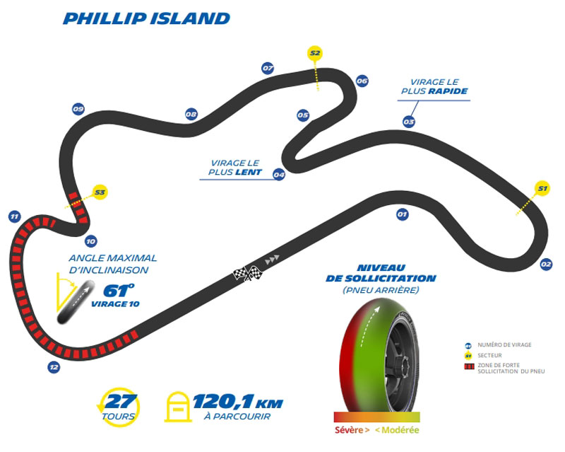• Circuit asymétrique par excellence, Phillip Island impose des contraintes extrêmes sur le flanc gauche des pneus, notamment à l’arrière, en raison de ses longues courbes rapides et de ses conditions souvent fraîches et venteuses.