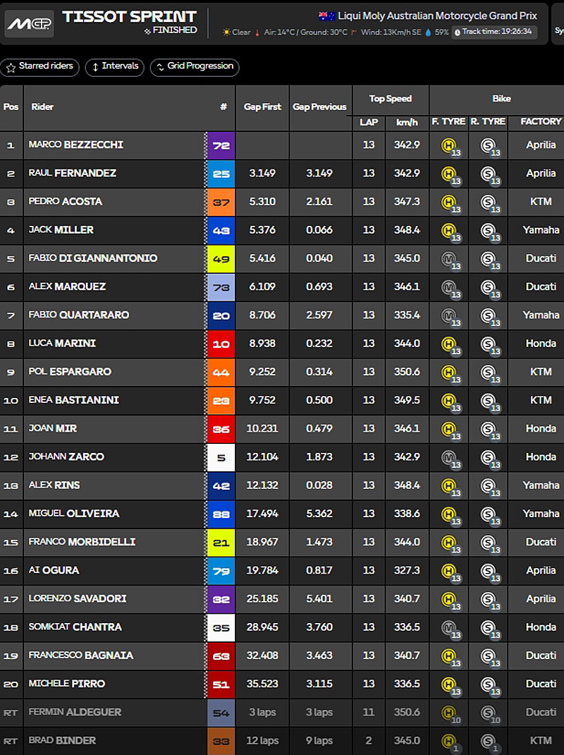 Sprint | Martin, MMarquez, Bastianini (Voir ici) | Bezzecchi, Raul Fernandez, Acosta (Voir ici) |