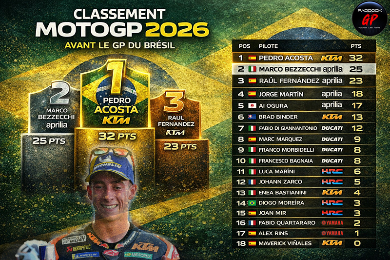 Après une ouverture plus qu’intéressante en Thaïlande, le championnat MotoGP met le cap vers l’ouest pour un retour très attendu au Brésil, avec Pedro Acosta (Red Bull KTM Factory Racing) comme leader inédit du classement général : qui l’eût réellement cru avant le premier Grand Prix ?