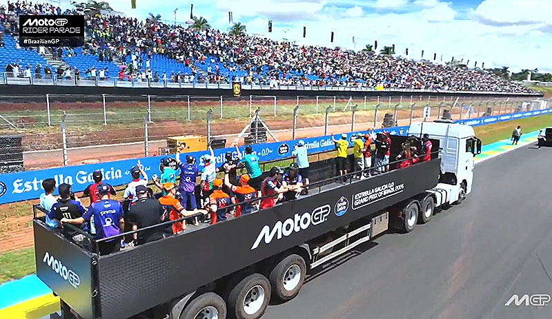 La parade des pilotes MotoGP a su faire sa place dans le programme du week-end en devenant une tradition qui satisfait à la fois les spectateurs présents, aujourd’hui Senna pour le Grand Prix du Brésil, mais aussi les pilotes pour qui il s’agit du seul moment où ils peuvent communiquer tous ensemble sans enjeu.