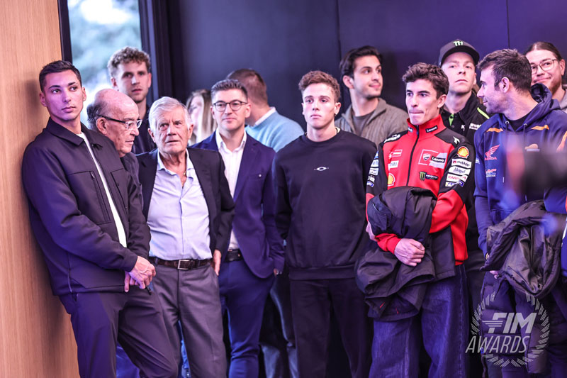 Une séance photo devant le RMM avec les Champions du Monde FIM 2025 a conclu l’inauguration, laquelle a été suivie par la cérémonie des FIM Awards au SwissTech Convention Center d’Écublens / Lausanne.