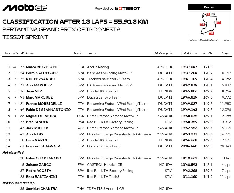 Résultat du Sprint au Grand Prix d’Indonésie MotoGP 2025 :