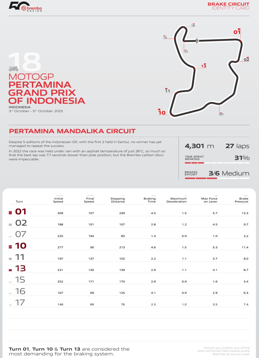 Pour écrire ce 18e chapitre de la saison MotoGP 2025, il faudra parcourir 13 fois le tracé de 4301 mètres lors du Sprint de samedi et effectuer 27 boucles le dimanche.