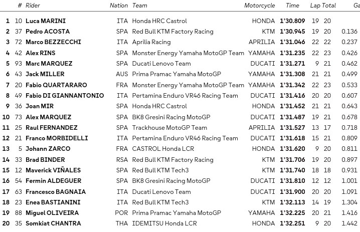 Ce matin en FP1, si Luca Marini a choisi de passer des pneus neufs en fin de séance pour arracher le meilleur temps, on constate avec plaisir la présence de tous les constructeurs dans le top 5 !