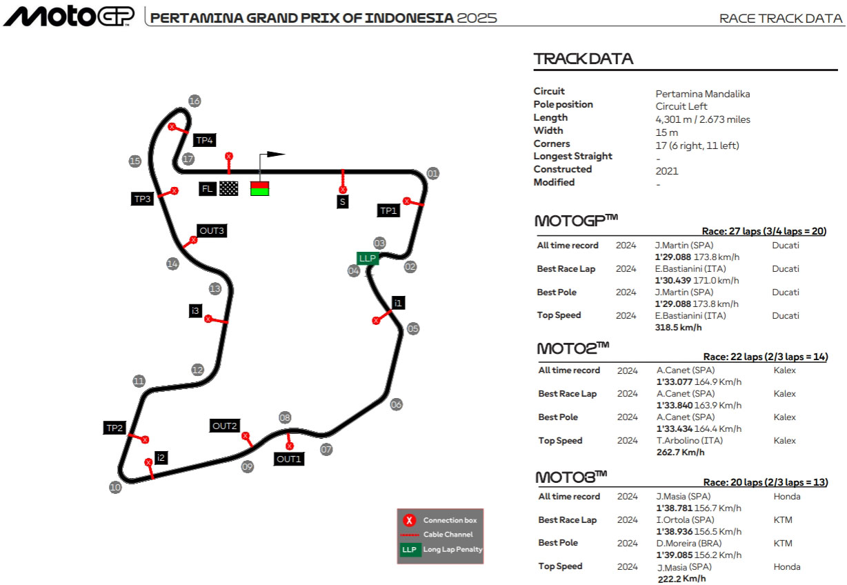 Dans la liste des inscrits à ce Grand Prix d’Indonésie 2025 ne figurent malheureusement pas les noms de Jorge Martin (Aprilia Racing), clavicule cassée au Japon, et Ai Ogura (Trackhouse MotoGP Team), souffrant toujours de sa chute à Misano.